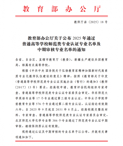 近日,教育部办公厅印发《教育部办公厅关于公布2025年通过普通高等学校师范类专业认证专业名单及中期审核专业名单的通知》(教师厅函〔2025〕18号),马克思主义学院思想政治教育专业成功通过普通高等学校师范类专业第二级专业认证。这一成果标志着该专业在教师教育质量、人才培养体系、实践教学环节等方面达到国家师范类专业认证标准,为学校思想政治教育高素质教师培养筑牢了根基。