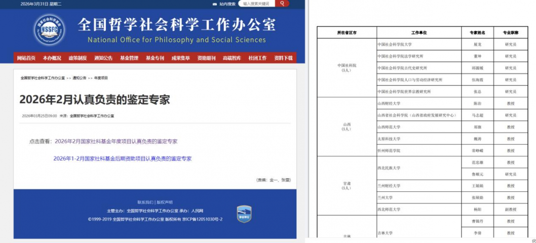 在本次公布的国家社科基金项目2026年2月认真负责的鉴定专家中,全国共有247人获评,其中山西省5人,马志超院长名列其中。